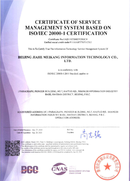12月,嘉和美康順利通過(guò)國(guó)家權(quán)威機(jī)構(gòu)ISO20000:2011管理體系測(cè)評(píng),榮獲ISO20000信息技術(shù)服務(wù)管理認(rèn)證。