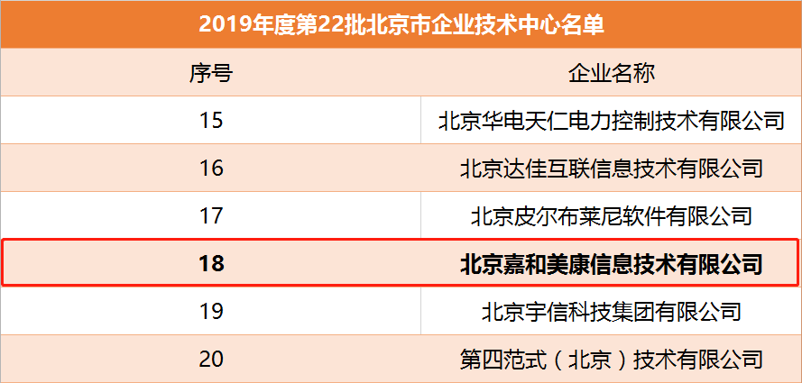 9月,在北京市經(jīng)濟(jì)和信息化局組織的2019年度第22批北京市企業(yè)技術(shù)中心的創(chuàng)建評(píng)價(jià)工作中嘉和美康通過(guò)資格核查并認(rèn)定為北京市企業(yè)技術(shù)中心,這標(biāo)志著嘉和美康的技術(shù)研發(fā)體系和自主創(chuàng)新能力建設(shè)再上新臺(tái)階。