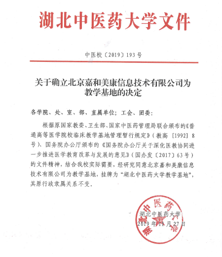 嘉和美康確認(rèn)為“湖北中醫(yī)藥大學(xué)教學(xué)基地”