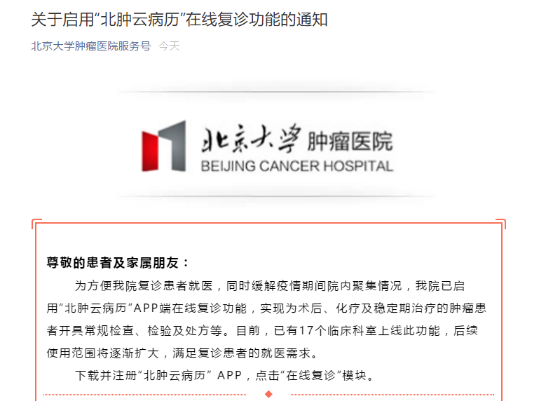 近期,由嘉和美康提供技術支持的北京大學腫瘤醫(yī)院“北腫云病歷”APP端在線復診功能正式開通。