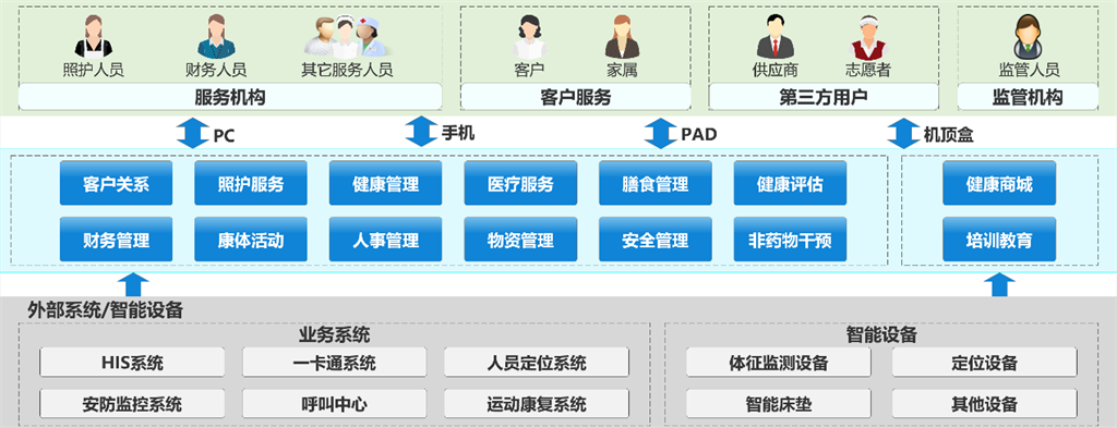 嘉和健康養(yǎng)老管理信息系統(tǒng)以客戶一體化養(yǎng)老需求為出發(fā)點,從入出轉(zhuǎn)等業(yè)務(wù)辦理到養(yǎng)護文娛等日常養(yǎng)老生活,很好的支撐了養(yǎng)老運營的標準化、精細化、智能化管理需求。系統(tǒng)結(jié)合各類智能終端,通過與相關(guān)外部系統(tǒng)及智能設(shè)備的對接,形成一體化醫(yī)養(yǎng)結(jié)合養(yǎng)老解決方案。
