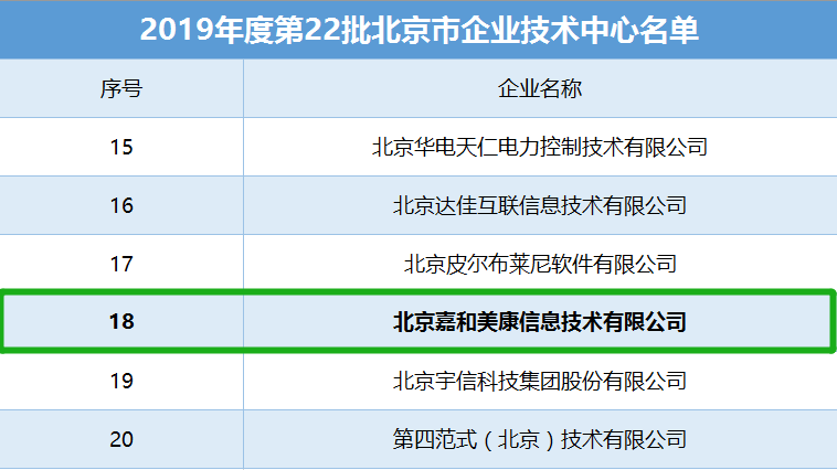 近日,北京嘉和美康信息技術(shù)有限公司在北京市經(jīng)濟和信息化局組織的2019年度第22批北京市企業(yè)技術(shù)中心的創(chuàng)建評價工作中通過資格核查并認(rèn)定為北京市企業(yè)技術(shù)中心。